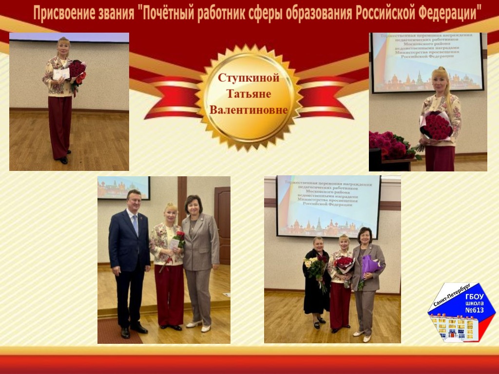 10 октября 2025 года в администрации Московского района состоялась церемония награждения представителей педагогического сообщества. Ступкина Татьяна Валентиновна, учитель нашей школы, за многолетний добросовестный труд, значительные заслуги в сфере образования, победы в конкурсах профессионального мастерства удостоена звания «Почетный работник сферы образования Российской Федерации». Поздравляем Татьяну Валентиновну с заслуженной наградой и желаем новых профессиональных достижений!